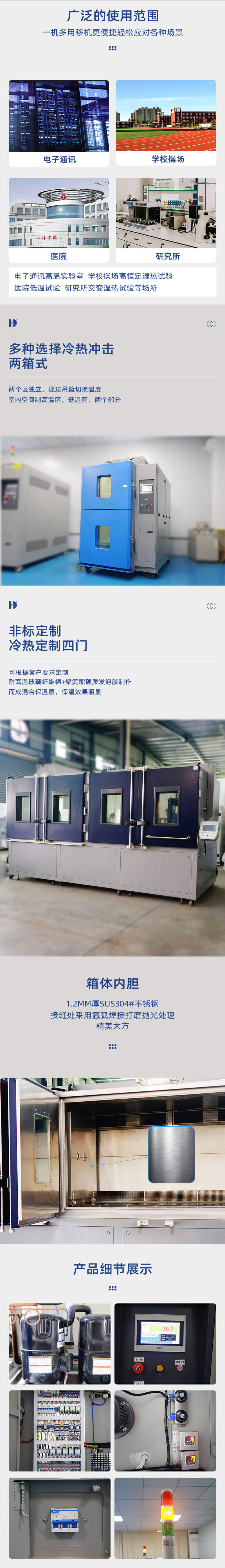 預熱工作室、預冷工作室、常溫沖擊室、試驗工作室間采用加厚保溫層斷熱,接口處采用耐高溫環氧樹脂板斷熱,有效防止熱量互串達到節能的目的;同時預熱工作室、預冷工作室、試驗工作室箱門內板均采用環氧樹脂板進行斷熱,有效防止熱量傳到設備外表影響設備安裝控件溫度,安全可靠。 |