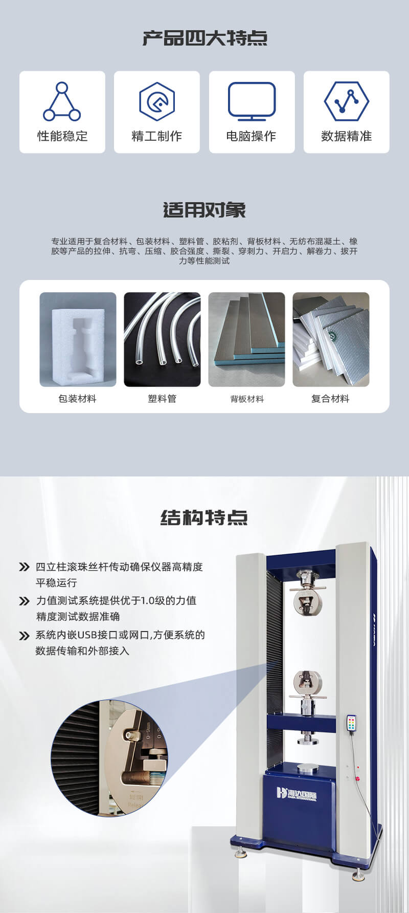 金屬材料萬(wàn)能拉力機(jī)適用于復(fù)合材料、包裝材料、塑料管、膠粘劑、背板材料、無(wú)紡布、混凝土、橡膠等高強(qiáng)度非金屬材料和醫(yī)療器械、線纜、鋼材等金屬產(chǎn)品的拉伸、抗彎、壓縮、膠合強(qiáng)度、撕裂、穿刺力、開(kāi)啟力、解卷力、拔開(kāi)力等性能測(cè)試。