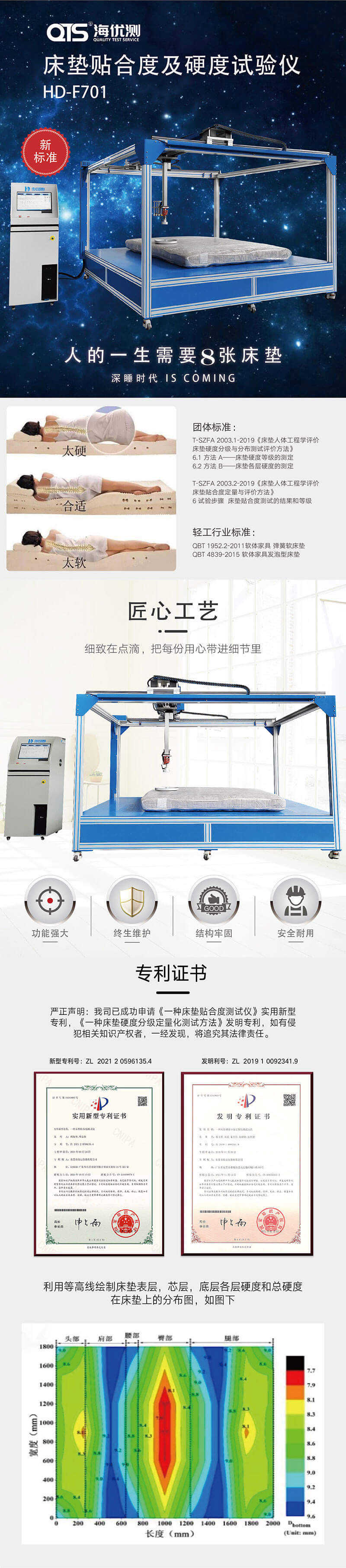 床墊貼合度綜合試驗機用于對家庭、酒店、旅館、飯店等場合使用的彈簧軟床墊和發泡型床墊進行出廠成品檢測,對床墊硬度和滯后損失率及貼合度進行測試,測試完成后根據測試評定試樣的等級。