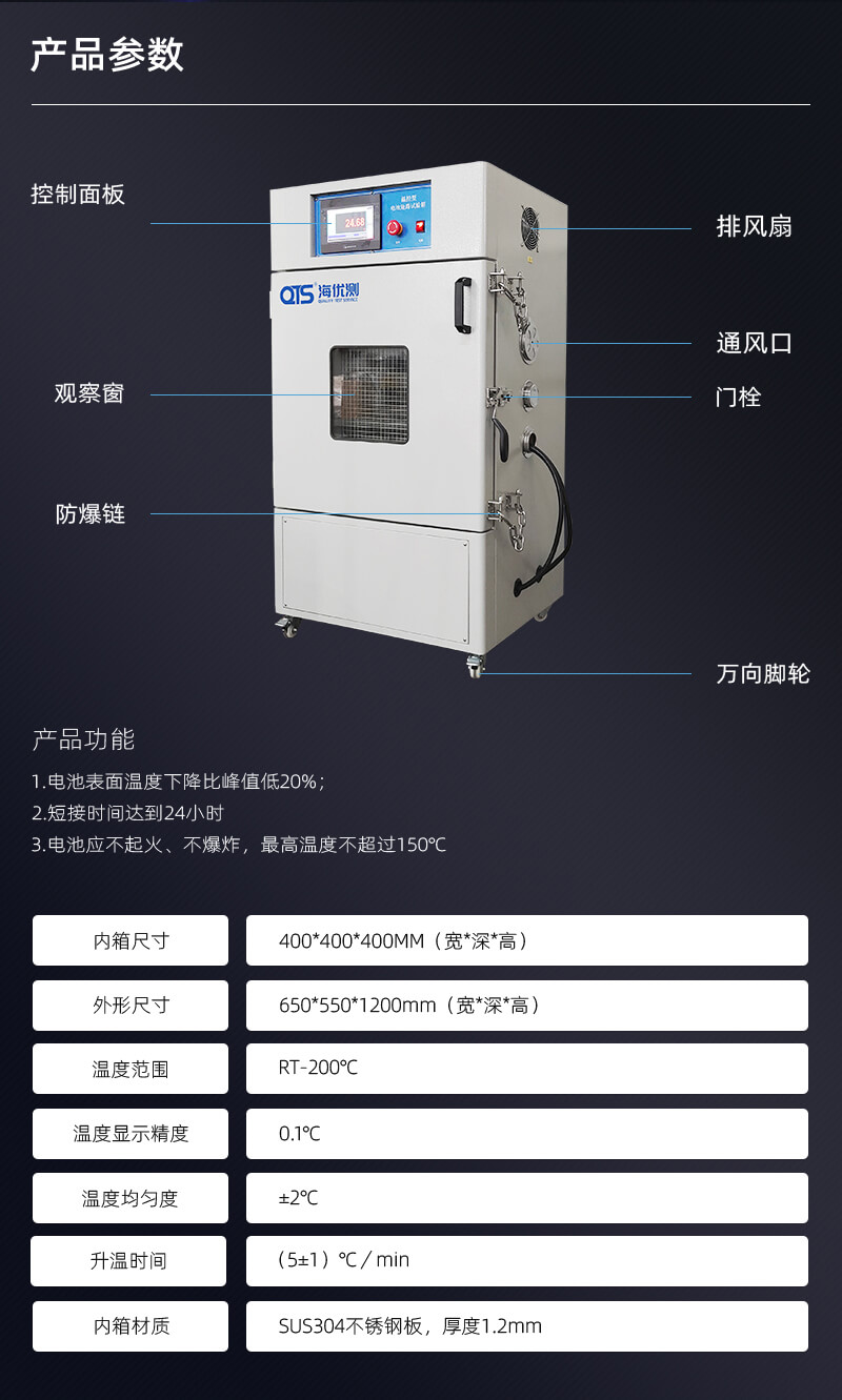 將充滿電的電池,放置一定的環(huán)境中,然后用導線連接電池正負極端,并保證全部外部電阻值嗎,試驗過程中監(jiān)測電池表面溫度變化,當出現下兩種情形之一時,試驗終止:電池應不起火、不爆炸,最高溫度不超過150℃。